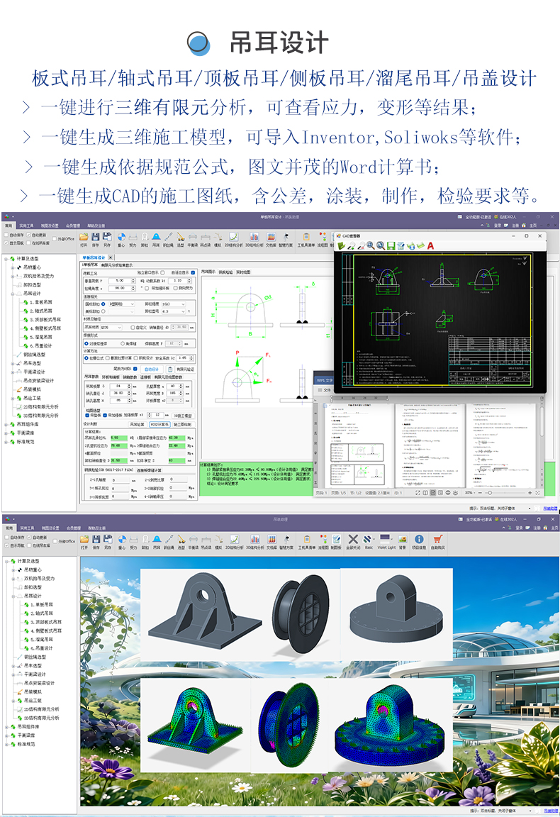 2. 增加板式吊耳连接板焊缝计算和长宽等调节参数;3. 增加板式吊耳,轴式吊耳,吊盖的三维有限元建模及分析。